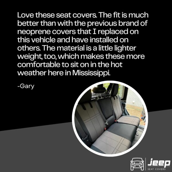 Love these seat covers. The fit is much better than with the previous brand of neoprene covers that I replaced on this vehicle and have installed on others. The material is a little lighter weight, too, which makes these more comfortable to sit on in the hot weather here in Mississippi. I really like that these can be ordered in two-tone - the gray middle accent really makes these covers look good and match my Jeep. I also appreciate that even the cut-outs for seat controls seem custom-made for my vehicle (2023 Wrangler JL 4xe). Install time for the whole set was about an hour, including removal and re-install of the 60% rear seat cover because I forgot to thread it under the seat belt on the first try. There are even cut-outs for the cup holders in the rear fold-down arm rest - just a very well done set of covers!!